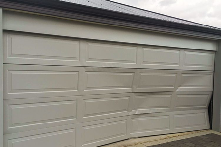A dangerous situation. Our experts realign your door and replace snapped cables to prevent total collapse.